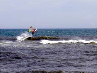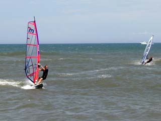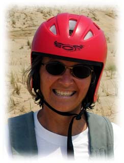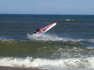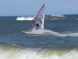 Our gracious Hatteras hosts, Sherry and Greg Waller, share their house for 5 days and their local knowledge of where to windsurf with their guests from FL & PA. Eric & Susan Gardner land in Hatteras too, to join up for windsurfing, surfing, sightseeing and dining out. Top L-R Photos: Ron Duck Jibe; Sherry Tacking & Eric Planing. Bottom L-R Photos: Eric Jibing; Greg Launching. (Sailing photos by Susan Gardner).